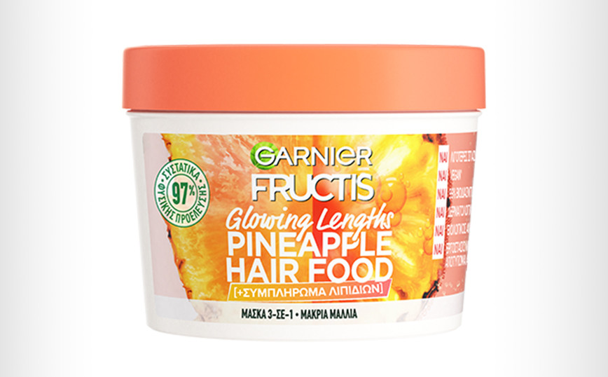 H σειρά Fructis Hair Food, ενισχυμένη με superfoods, έχει τη λύση για κάθε ανάγκη και τύπο μαλλιών. Η νέα προσθήκη Hair Food Pineapple, ιδανική για μακριά μαλλιά που διψάνε για ενυδάτωση μόλις έφτασε! Πρόκειται για την πρώτη Hair Food μάσκα από την Garnier που συνοδεύεται από πολλαπλά οφέλη, καθώς χαρίζει 7 φορές περισσότερη ενυδάτωση στα μακριά μαλλιά ενώ τα προστατεύει, κάνοντας τα πιο δυνατά με 50% λιγότερες σπασμένες άκρες. Η νέα Hair food Pineapple Mask, είναι εμπλουτισμένη με Ανανά και αποτελεί πλούσια πηγή βιταμίνης C, που συμβάλει στην φυσική λάμψη των μαλλιών και στην ενυδάτωση της τρίχας. Είναι κατάλληλη για όλους τους τύπους μακριών μαλλιών. Οι μάσκες Hair Food, με 97% συστατικ