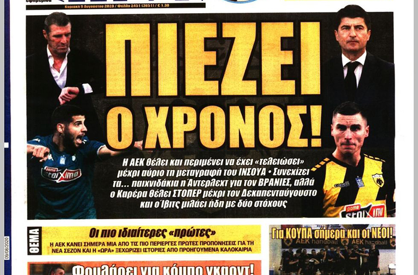 Όλα όσα γράφουν σήμερα (11/8) οι εφημερίδες για την ΑΕΚ SportDay «Να περάσουν οι επόμενοι», γράφει η εφημερίδα καθώς η ΑΕΚ απέσυρε το ενδιαφέρον της για Ινσούα και Βράνιες LiveSport «Ρελάνς με 3», γράφει η εφημερίδα καθώς ο Ίλια Ίβιτς ετοιμάζεται για χτυπήματα με στόπερ, αριστερό μπακ και φορ Sportime «Ανατροπή», γράφει η εφημερίδα που […]