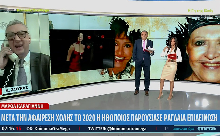 Για την καλή του φίλη, Μάρθα Καραγιάννη η οποία έφυγε από τη ζωή σε ηλικία 82 ετών, την Κυριακή, μίλησε ο ψυχίατρος Δημήτρης Σούρας στην εκπομπή «Κοινωνία Ώρα ΜEGA». «Η Μάρθα εδώ και 2 χρόνια μετά από 2 εγχειρήσεις που είχε κάνει, είχε κάποια κινητικά προβλήματα. Λόγω αυτών των προβλημάτων είχε κλειστεί στο σπίτι και έβλεπε τους απαραίτητους φίλους, δεν έβγαινε έξω λόγω αυτών των δυσκολιών και αυτό κατά κάποιο τρόπο την είχε κλείσει μέσα στο σπίτι. Πάντως μιλούσαμε συχνά, διηγούμασταν ιστορίες, κάτι τέτοιο έγινε και χθες. Και ξαφνικά στη 1 παρά 10 χτύπησε το τηλέφωνο και ήταν η Ντόρα, η φίλη-αδερφή της Μάρθας που έμεναν μαζί 40 χρόνια. Μου είπε ότι η Μάρθα δε μιλάει καλά και παραξενεύτηκα