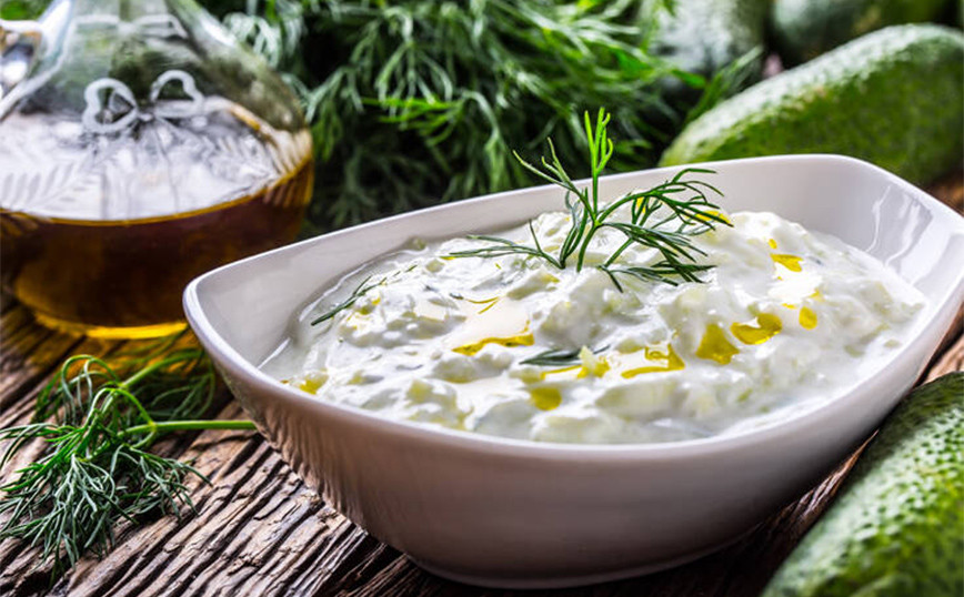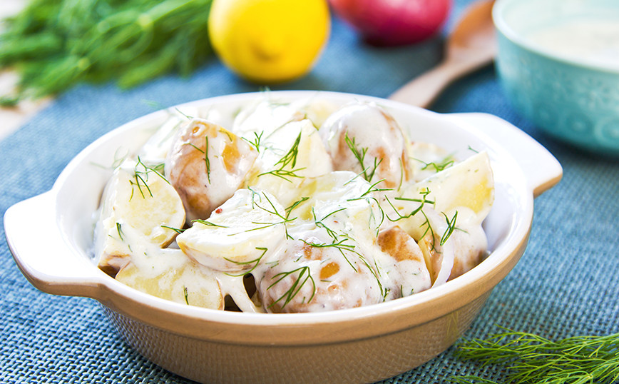 Υλικά 1 κιλό μικρές πατάτες, κομμένες στη μέση 1 συσκευασία έτοιμο τζατζίκι 2 κλωναράκια σέλινου, σε λεπτές φέτες 1/2 φλ. τσαγιού γιαούρτι 2 φρέσκα κρεμμυδάκια, ψιλοκομμένα 2 κ. σ. ψιλοκομμένο φρέσκο άνηθο 2 κ. σ. ψιλοκομμένο φρέσκο μαϊντανό 1/2 κ. γλ. αλάτι 1/4 κ. γλ. πιπέρι 1 κ. σ. ψιλοκομμένη φρέσκια μέντα, προαιρετικά Εκτέλεση Βράστε τις πατάτες μέχρι να μαλακώσουν, 10-15 λεπτά. Σουρώστε και αφήστε να κρυώσουν καλά. Σε ένα μικρό μπολ, ανακατέψτε το τζατζίκι, το σέλινο, το γιαούρτι, τα φρέσκα κρεμμυδάκια, τον άνηθο, το μαϊντανό, το αλάτι, το πιπέρι και, αν θέλετε, το δυόσμο. Ρίξτε τη σος με το κουτάλι πάνω από τις πατάτες και ανακατέψτε μέχρι να καλυφθούν καλά όλες. Βάλτε τις πατάτες σ