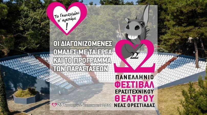 Εικοσιδύο χρόνια συμπληρώνει φέτος το Πανελλήνιο Φεστιβάλ Ερασιτεχνικού Θεάτρου Νέας Ορεστιάδας και, παρά τις αντίξοες συνθήκες τα δύο τελευταία καλοκαίρια, το... Γκατζολάκι βάζει τα δυνατά του για να αντεπεξέλθει άλλη μία φορά στις προκλήσεις, με επιμονή και υπομονή όπως πάντα. Έτσι, παντελώς εμβολιασμένο και αισιοδοξία γεμάτο, χαμογελά στη ζωή και βγάζει τη γλώσσα στις κακοτοπιές, υποσχόμενο ένα 8ήμερο Γιορτής στο τέλος του καλοκαιριού, με σύμβολό του φέτος μία μεγάλη καρδιά, αυτή που σχηματίζουν τα 22 χρόνια ειλικρινούς Αγάπης για το Θέατρο, την Τέχνη, τον Πολιτισμό, στη νεότερη και βορειότερη πόλη της Ελλάδας, τη Νέα Ορεστιάδα Έβρου.Το 22ο Πανελλήνιο Φεστιβάλ Ερασιτεχνικού Θεάτρου Νέας Ορεστ