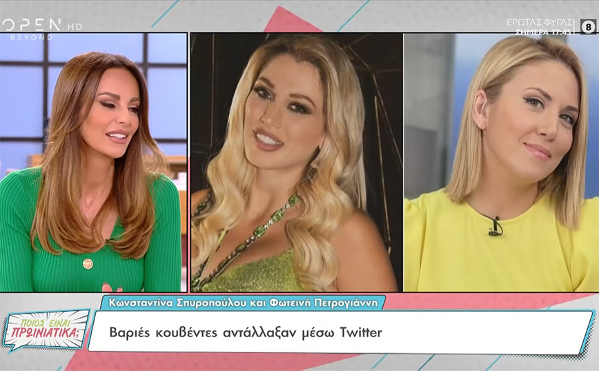 Την κόντρα της Κωνσταντίνας Σπυροπούλου με την Φωτεινή Πετρόγιαννη η οποία ξέσπασε μέσω του διαδικτύου καθώς οι δυο γυναίκες αντάλλαξαν τα πυρά τους στο twitter, σχολίασαν οι συντελεστές της εκπομπής «Ποιος είναι πρωινιάτικα;» του Open. «O νόμος της φύσης. Τον αδύναμο τον τρώνε τα τσακάλια, τέλος! Άμα δείξεις μια μικρή αδυναμία, θα πέσουν να σε φάνε. Αυτό είναι στανταράκι. Όταν βγαίνει και κάνει αυτή τη δήλωση, που είναι μία μεταμέλεια, σου λέει “μετανιώνεις;” και πέφτω πάνω σου. Έχει ακούσει τα εξ αμάξης γιατί είχαν ακουστεί πράγματα, ακούγαμε ότι έχαναν άνθρωποι τη δουλειά τους, γι’ αυτό συμβαίνει αυτό που συμβαίνει», είπε αρχικά η Μπέττυ Μαγγίρα. Η Μπέττυ Μαγγίρα είπε στη συνέχεια: «Ακ