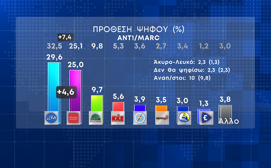 Δημοσκόπηση GPO: Κάτω από το 4% η διαφορά μεταξύ ΝΔ και ΣΥΡΙΖΑ