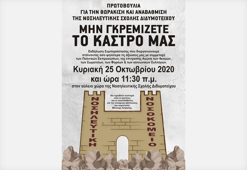 Η Συντονιστική Επιτροπή της Πρωτοβουλίας για την Θωράκιση και Αναβάθμιση της Νοσηλευτικής Σχολής Διδυμοτείχου, εκφράζοντας την αγωνία των Συλλόγων και Φορέων και κατά επέκταση της κοινωνίας μας, σχετικά με το μέλλον της Νοσηλευτικής Σχολής Διδυμοτείχου, διοργανώνει Εκδήλωση Συμπαράστασης με σκοπό να στείλει όσο ψηλότερα τις αξιώσεις της. Η Συντονιστική Επιτροπή σας προσκαλεί να παραβρεθείτε στην συνάντηση που θα συμμετέχουν εκπρόσωποι των πολιτικών φορέων, της επιτροπής Αγώνα των θεσμών, των Σωματείων και των κοινωνικών Συλλόγων, την Κυριακή, 25 Οκτωβρίου 2020 και ώρα 11:30 π.μ. στον αύλειο χώρο της Νοσηλευτικής Σχολής Διδυμοτείχου.Η παρουσία σας θα δυναμώσει την φωνή να εισακουστούν όλα τα αιτή