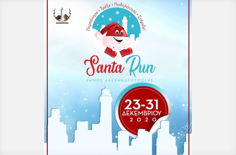 Δήμος Αλεξανδρούπολης καλεί μικρούς και μεγάλους να συμμετάσχουν στο SANTA RUN Alexandroupolis 2020! Μια δράση με στόχους την ψυχική ανάταση των πολιτών εν μέσω πανδημίας, τη δημιουργία Χριστουγεννιάτικου κλίματος, την ενίσχυση της ήπιας άσκησης αλλά και της εθελοντικής προσφοράς. Η δράση είναι διαδικτυακή, ατομική, ήπιας άθλησης, και περιλαμβάνει συμμετοχή με περπάτημα, τρέξιμο ή ποδηλασία, σε χώρο, χρόνο και απόσταση ελεύθερης επιλογής και θα πραγματοποιηθεί από τις 23 έως τις 31 Δεκεμβρίου 2020.Οι συμμετέχοντες, φορώντας απαραίτητα το σκουφάκι του Άγιου Βασίλη, αποστέλλουν με μήνυμα στη σελίδα SANTA RUN Alexandroupolis στο Facebook φωτογραφία ή video (έως 15 δεύτερα) με τη δράση τους και μια