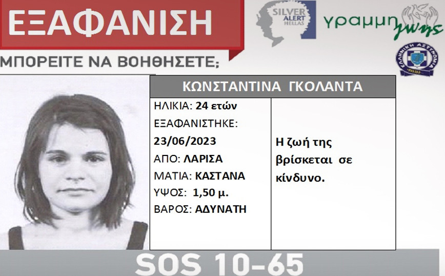 Η 24χρονη Κωνσταντίνα εξαφανίστηκε από το σπίτι της στην περιοχή του Αγίου Κωνσταντίνου, στη Λάρισα, το πρωί της Παρασκευής, 23 Ιουνίου, σύμφωνα με ανακοίνωση από τη Γραμμή Ζωής. Το αποτέλεσμα ήταν να ενεργοποιηθεί συναγερμός Silver Alert για την κινητοποίηση όλων για την ανεύρεσή της. «Η ζωή της βρίσκεται σε κίνδυνο», τονίζεται χαρακτηριστικά. Ειδικότερα, στη σχετική ανακοίνωση επισημαίνεται: «Υπάρχει εξαφάνιση ενήλικης από τη Λάρισα. Η Κωνσταντίνα Γκόλαντα, 24 ετών, εξαφανίστηκε από το σπίτι της, στην περιοχή του Αγίου Κωνσταντίνου, στη Λάρισα, το πρωί της 23/06/23. Έχει μακριά μαύρα μαλλιά, καστανά μάτια, ύψος 1,50μ και είναι αδύνατη. Η ΓΡΑΜΜΗ ΖΩΗΣ, ειδοποιήθηκε από τους οικείους της τ