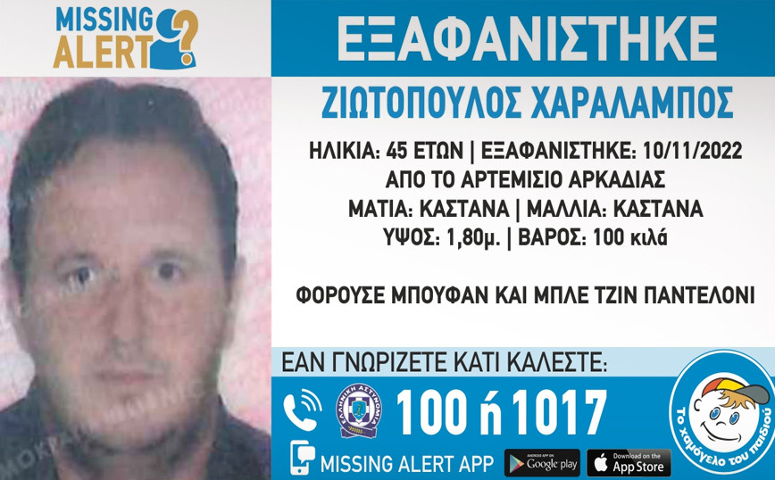 Συναγερμός έχει σημάνει στις Αρχές για την εξαφάνιση του 45χρονου Χαράλαμπου Ζιωτόπουλου από την περιοχή του Αρτεμισίου Αρκαδίας. Σύμφωνα με το Χαμόγελο του Παιδιού «υπάρχουν σοβαρές ενδείξεις ότι η ζωή του βρίσκεται σε κίνδυνο». Σύμφωνα με το Missing Alert, ο Ζιωτόπουλος Χαράλαμπος, 45 ετών, εξαφανίστηκε πρωινές ώρες της 10ης Νοεμβρίου 2022. Το «Χαμόγελο του Παιδιού» ενημερώθηκε για την εξαφάνιση του Ζιωτόπουλου Χαράλαμπου σήμερα, 03.01.2023, και προχώρησε στη δημοσιοποίηση των στοιχείων του ενηλίκου κατόπιν αιτήματος της οικογένειας του, καθώς υπάρχουν σοβαρές ενδείξεις ότι η ζωή του βρίσκεται σε κίνδυνο. Ο Ζιωτόπουλος Χαράλαμπος έχει ύψος 1.80 μ., έχει βάρος 100 kg, έχει καστανά κοντά