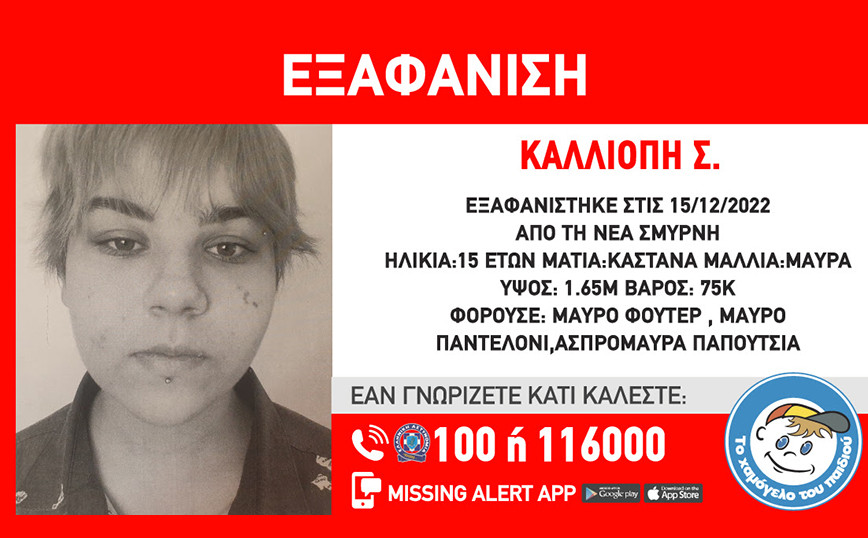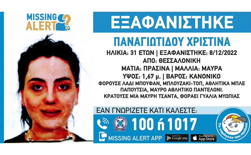 Missing Alert εξέδωσε το Χαμόγελο του Παιδιού για μια 31χρονη γυναίκα η οποία εξαφανίστηκε στη Θεσσαλονίκη. Ειδικότερα, όπως ανακοινώθηκε, στις 08/12/2022, πρωινές ώρες, εξαφανίστηκε από την περιοχή της Θεσσαλονίκης, η Παναγιωτίδου Χριστίνα, 31 ετών. Το «Χαμόγελο του Παιδιού προχώρησε σήμερα στη δημοσιοποίηση των στοιχείων της ενήλικης κατόπιν αιτήματος της οικογένειάς της, καθώς ενδέχεται να συντρέχουν λόγοι οι οποίοι θέτουν τη ζωή της σε κίνδυνο. Η Παναγιωτίδου Χριστίνα έχει ύψος 1,67 μ., έχει κανονικό βάρος, έχει μαύρα μαλλιά και πράσινα μάτια. Φορούσε λαδί μπουφάν, μπλουζάκι-τοπ, μαύρο αθλητικό παντελόνι, αθλητικά μπλε παπούτσια. Κρατούσε μια μαύρη τσάντα και φοράει γυαλιά μυωπίας. Οπ