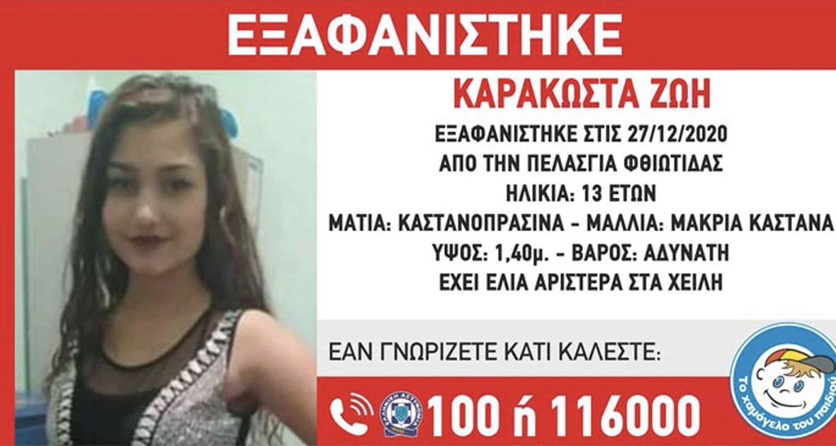 Σύμφωνα με το Χαμόγελο του Παιδιού «στις 27/12/2020, πρωινές ώρες, εξαφανίστηκε από το σπίτι της στην Πελασγία Φθιώτιδας, η Ζωή Καρακώστα, 13 ετών, ελληνικής καταγωγής.