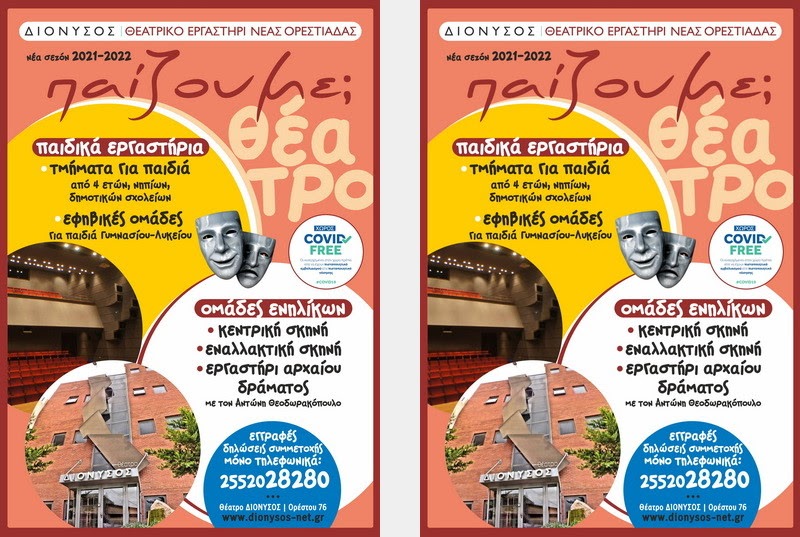 Το Θεατρικό Εργαστήρι Νέας Ορεστιάδας ΔΙΟΝΥΣΟΣ απευθύνει κάλεσμα για εγγραφές στα παιδικά θεατρικά εργαστήρια και στο θεατρικό εργαστήρι ενηλίκων. Εγγραφές στα παιδικά θεατρικά εργαστήρια Ξεκίνησαν οι εγγραφές για τα παιδικά θεατρικά εργαστήρια που και φέτος θα λειτουργήσουν στο ΔΙΟΝΥΣΟ, και συγκεκριμένα για: παιδιά από 4 ετών, προνήπια, νήπια.παιδιά Δημοτικού Σχολείου.εφηβικές ομάδες Γυμνασίου και Λυκείου.Η πρώτη συνάντηση όλων των παιδικών και εφηβικών τμημάτων προγραμματίζεται να γίνει, εκτός απροόπτου, το Σάββατο 2 Οκτωβρίου στις 16:30 προκειμένου να καταρτιστεί το πρόγραμμα των μαθημάτων και να γίνει η ενημέρωση γονέων και παιδιών για τον τρόπο που φέτος θα λειτουργήσουν τα τμήματα, υπό τις