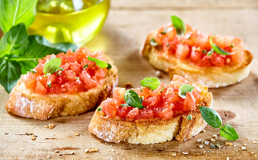 Υλικά 4 κ. σ. ελαιόλαδο 2 σκελίδες σκόρδο, σε λεπτές φέτες 4 μεγάλες ντομάτες, κομμένες σε κύβους 1/4 φλ. τσαγιού φρέσκο βασιλικό ψιλοκομμένο 2 κ. σ. βαλσάμικο ξύδι 1 κ. γλ. αλάτι Μια πρέζα κόκκινο πιπέρι Για το ψωμί: 1 μεγάλη μπαγκέτα, κομμένη σε φέτες, εξαιρετικό παρθένο ελαιόλαδο, 2 σκελίδες σκόρδο, κομμένες στη μέση Εκτέλεση Σε ένα τηγάνι σε μέτρια προς χαμηλή φωτιά, ζεστάνετε το λάδι. Προσθέστε το σκόρδο και μαγειρέψτε το μέχρι να πάρει ελαφρύ χρώμα, 2 έως 4 λεπτά, στη συνέχεια αφαιρέστε το από τη φωτιά και αφήστε το να κρυώσει. Σε ένα μεγάλο μπολ, ανακατέψτε τις ντομάτες, το βασιλικό, το ξύδι, το αλάτι και τις νιφάδες κόκκινου πιπεριού. Προσθέστε το σκόρδο και το λάδι από το τηγάνι
