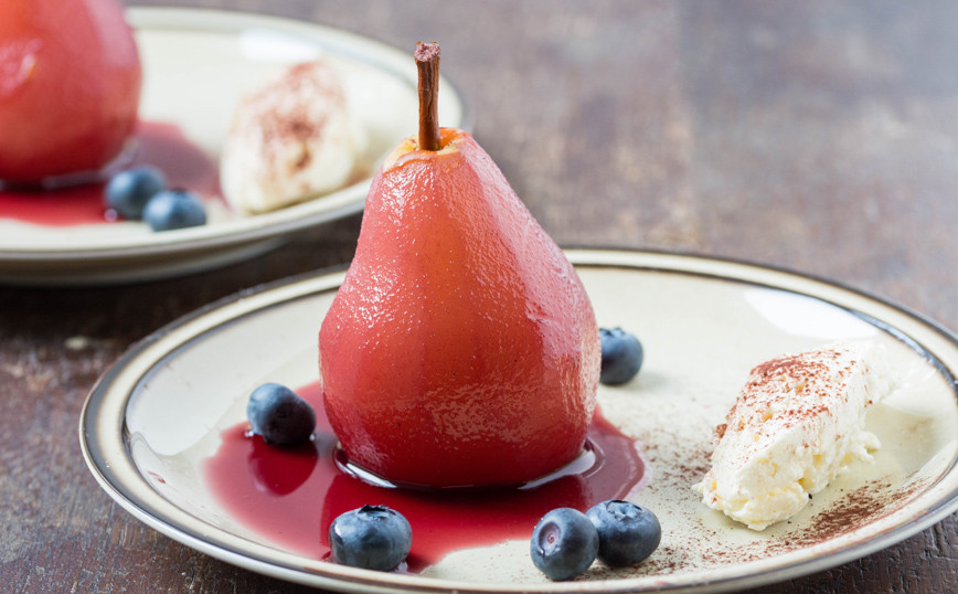 Αχλάδια με σάλτσα κόκκινου κρασιού