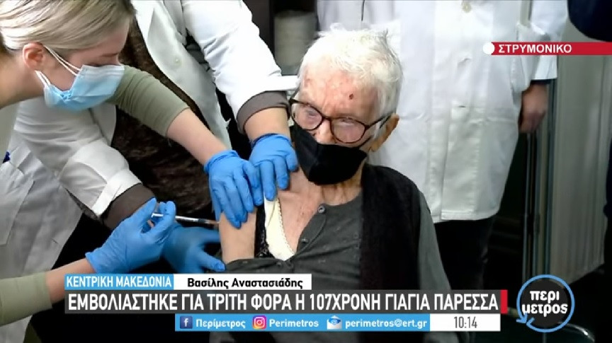 Από το Κέντρο Υγείας του Στρυμονικού Σερρών, μια αξιαγάπητη γιαγιά 107 ετών έκανε την 3η δόση του εμβολίου κατά του κορονοϊού και έστειλε το δικό της μήνυμα για να εμβολιαστούν κι άλλοι. Με το χαμόγελο στα χείλη, η γιαγιά Παρέσσα, συνοδευόμενη από τον γιό της Γιάννη Ορφανίδη, συνάντησε τους γιατρούς και το νοσηλευτικό προσωπικό που ζήτησαν να βγουν φωτογραφίες μαζί της αφού της έκαναν το εμβόλιο. Εκεί είχε κάνει και τις προηγούμενες δύο δόσεις. Μάλιστα, η υπεραιωνόβια γυναίκα ζήτησε η ίδια από το γιο της να την πάει στο εμβολιαστικό κέντρο λέγοντάς του: «Πρέπει να κάνω το εμβόλιο, πρέπει να ακούμε τους γιατρούς». Αφού έλαβε την ενισχυτική δόση, μιλώντας στην κάμερα της ΕΡΤ, δήλωσε: «Τα εμ