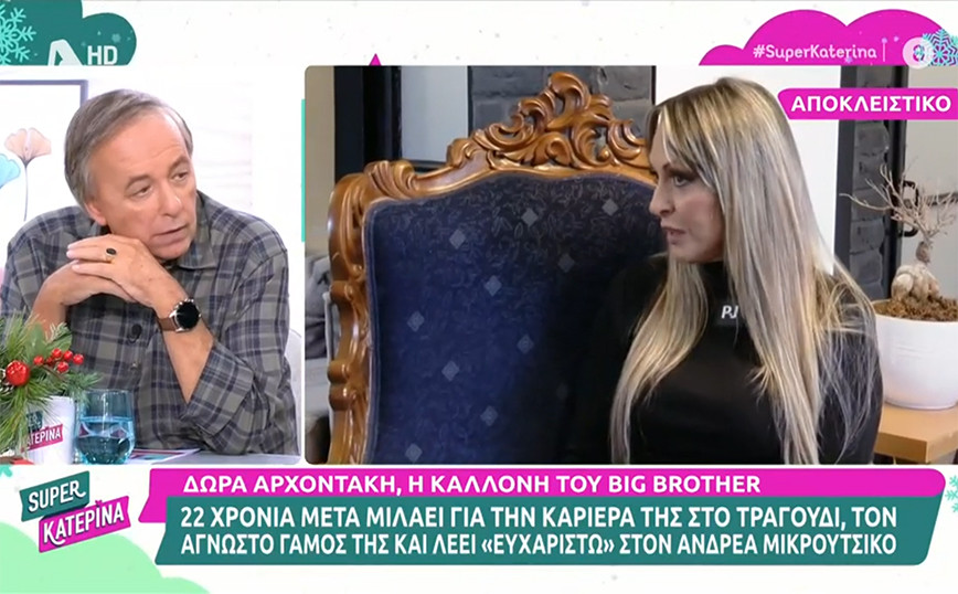 Η Δώρα Αρχοντάκη συστήθηκε στο ευρύ κοινό μέσα από την συμμετοχή της στο Big Brother πριν από πολλά χρόνια. Το πρωί της Τετάρτης (30/11), η Δώρα Αρχοντάκη αναφέρθηκε στην προσπάθεια που έκανε στο χώρο του τραγουδιού αλλά και στη βοήθεια που της πρόσφερε ο Ανδρέας Μικρούτσικος. Η Δώρα Αρχοντάκη σημείωσε χαρακτηριστικά πως «δεν είμαι περήφανη για τους λόγους για τους οποίους παντρεύτηκα, γιατί ήταν μια αντίδραση για να ξεχάσω τον μεγάλο έρωτα της ζωής μου. Πολύ λίγο καιρό κράτησε, έναν χρόνο περίπου και δυστυχώς πλήγωσα έναν άνθρωπο που δεν το άξιζε. Ποτέ δεν περνάει ο μεγάλος έρωτας, μένει πάντα στην καρδιά σου αλλά κάποια στιγμή το αποδέχεσαι. Από τότε έχουν περάσει και είκοσι χρόνια. Αυτ