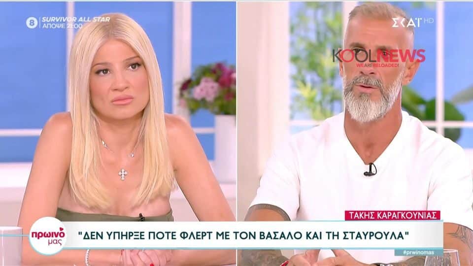 Ο Τάκης Καραγκούνιας, ο παίκτης που αποχώρησε τελευταία από το Survivor, κατά τη διάρκεια της πρωινής τηλεοπτικής εμφάνισής του στο “Πρωινό μου”, είχε πολλά να μας πει. Κατά τη συνομιλία του με την Φαίη Σκορδά, αναφέρθηκε ειδικά στο φημολογούμενο φλερτ μεταξύ Κωνσταντίνου Βασάλου και Σταυρούλας Χρυσαειδή, το οποίο, σύμφωνα με τον ίδιο, δεν υπήρξε ποτέ. […] The post Survivor Ελλάδας: Ο Καραγκούνιας τα είπε όλα. Η εμμονή της Μελίνας και το φλερτ Βασάλου-Σταυρούλας Όλη η αλήθεια στη Φαίη Σκορδά appeared first on Koolnews.gr.