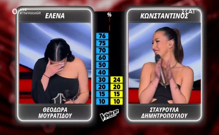 Έσπασε τα κοντέρ η Θεοδώρα Μουρατίδου από την ομάδα του Κωνσταντίνου Αργυρού στο 2ο live cross battle του «The Voice» απέναντι στην Σταυρούλα Δημητροπούλου από την ομάδα της Έλενας Παπαρίζου. Η Φαίη Σκορδά κλήθηκε να ανακοινώσει τα αποτελέσματα της ψηφοφορίας του τηλεοπτικού κοινού. Σύμφωνα με αυτήν, λοιπόν, η Θεοδώρα Μουρατίδου συγκέντρωσε το 76% έναντι 24% που συγκέντρωσε η Σταυρούλα Δημητροπούλου. Τότε η ηττημένη διαγωνιζόμενη έφυγε από τη σκηνή δίχως να χαιρετήσει την παρουσιάστρια του «The Voice». «Έλα, Σταυρούλα μου, περίμενε. Δεν θέλει η Σταυρούλα να μου πει τίποτα. Στεναχωρήθηκες, δεν πειράζει» τόνισε η Φαίη Σκορδά για να επιστρέψει, τρέχοντας, η Σταυρούλα Δημητροπούλου προς το μέ