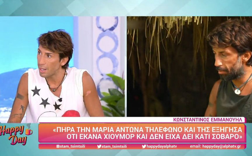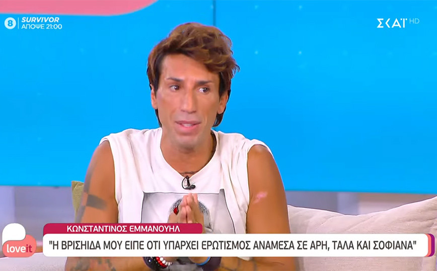 Στο πλατό της εκπομπής «Love It» βρέθηκε καλεσμένος ο Κωνσταντίνος Εμμανουήλ το μεσημέρι της Πέμπτης (02/06) και η συμμετοχή του στο Survivor βρέθηκε στο επίκεντρο της συζήτησης. Ο make up artist ο οποίος ήταν ένας από τους πλέον συζητημένους παίκτες του Survivor αναφέρθηκε στον Άρη Σοϊλέδη, την Σοφιάννα Αβραμάκη αλλά και τη Μαρία Αντωνά με την οποία ήρθε σε επαφή μετά την αποχώρησή του από το Survivor. «Μίλησα με τη Μαρία Αντωνά, γιατί είμαι πολύ τίμιος και όταν βγήκα, την πήρα προσωπικά εγώ ο ίδιος και της είπα, ότι θέλω να της μιλήσω, γιατί είδα ότι το θέμα είχε πάρει διαστάσεις. Αυτά που είπα, υπάρχουν, τα είδα και τα είπα με πολύ χιουμοριστικό τρόπο. Δικαιολογήθηκε γιατί με πολέμησε