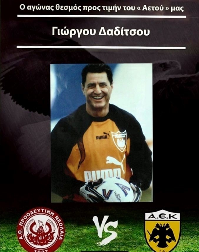 Ο αγώνας θεσμός βετεράνων Προοδευτικής και ΑΕΚ, που διεξάγεται στη μνήμη του Γιώργου Δαδίτσου, θα γίνει αύριο 14 Νοεμβρίου 2022 στο γήπεδο Νίκαιας-Κορυδαλλού (19:30), για 20η φορά. Και θα είναι ευκαιρία,  οι άσοι των δύο ομάδων, να βροντοφωνάξουν ότι ο «αετός», πετάει ακόμη δίπλα μας…