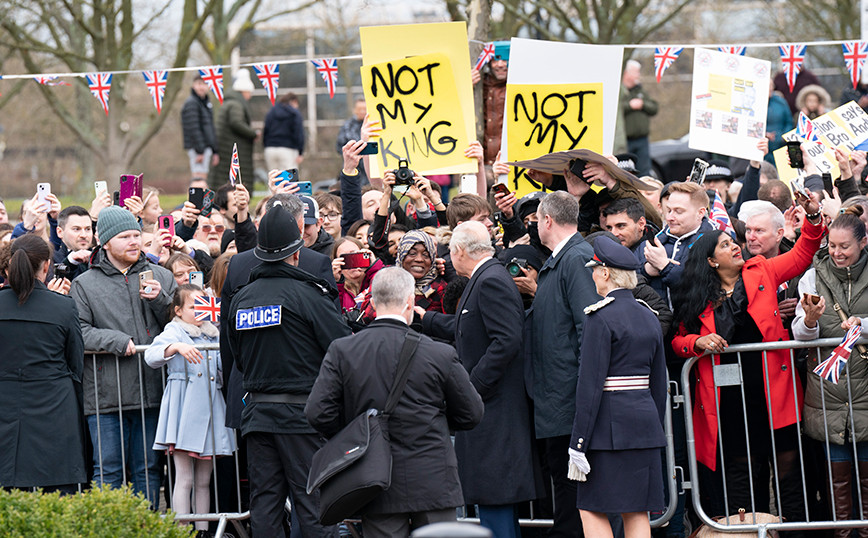 Ο βασιλιάς Κάρολος επισκέφθηκε το Μίλτον Κέινς της Βρετανίας και η πλειοψηφία μπορεί να τον υποδέχτηκε θερμά, όμως είχαν συγκεντρωθεί και ορισμένοι διαδηλωτές, που φώναξαν ότι δεν πιστεύουν στον θεσμό της μοναρχίας. Σύμφωνα με την dailymail.co.uk, η ομάδα Republic που αποτελούνταν από 20 άτομα, είχαν συγκεντρωθεί και σήκωσαν πλακάτ όταν τους προσέγγισε ο Βρετανός μονάρχης, που ανέγραφε: «Δεν είσαι ο βασιλιάς μου». «Πηγαίνουμε σήμερα στο Μίλτον Κέινς, για να κάνουμε μερικές ερωτήσεις στον βασιλιά. Μπορείτε να συμμετάσχετε στη διαμαρτυρία στο Church of Christ Cornerstone», έγραψαν στον επίσημο λογαριασμό στο Twitter τα μέλη της ομάδας. «Είμαστε αποφασισμένοι να περάσουμε το μήνυμα ότι είναι