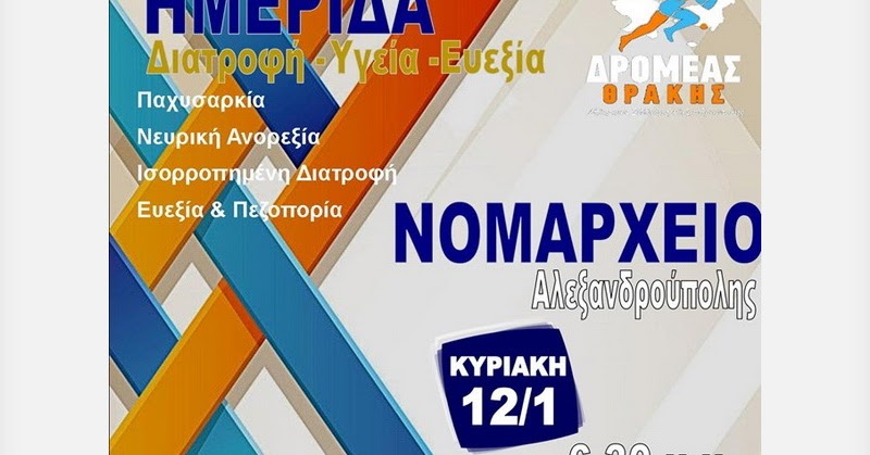 Ο αθλητικός σύλλογος ΔΡΟΜΕΑΣ ΘΡΑΚΗΣ, υπό την αιγίδα της Περιφερειακής Ενότητας Έβρου, διοργανώνει Ημερίδα με θέμα: «Διατροφή - Υγεία - Ευεξία», την Κυριακή 12 Ιανουαρίου 2020 στις 6:30 μ.μ. στο Νομαρχείο στην Αλεξανδρούπολη. Θέματα της ημερίδας: Παιδική παχυσαρκία, νευρική ανορεξία, ισορροπημένη διατροφή, ευεξία και πεζοπορία.Ομιλητές:Μιχάλης Πολυτσάκης, Καθηγητής Φυσικής Αγωγής, Μέλος Δ.Σ. Ένωσης Γυμναστών Β. Ελλάδος.Χριστίνα Παλαιολόγου, Ψυχολόγος.Άκης Τάκας, Διατροφολόγος M.Sc, M.Pr., εξειδίκευση στην διατροφή αθλητών και αθλουμένων και εξειδίκευση στις διατροφικές διαταραχές.Κική Τσακαλδήμη, Ορειβάτισσα.Είσοδος ελεύθερη[post_ads]
