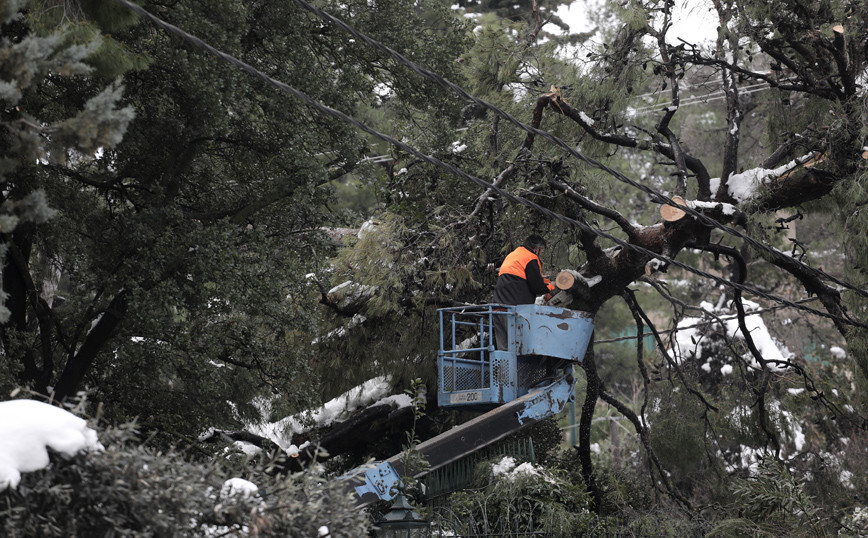 Σημειώνει παράλληλα ότι η σφοδρή χιονόπτωση που έπληξε τις περιοχές των Βορείων Προαστίων, συνεχίζει να προκαλεί πτώσεις δέντρων λόγω του συσσωρευμένου όγκου χιονιού.