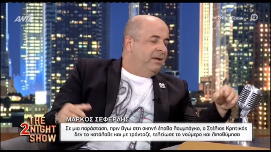 Καλεσμένος στην εκπομπή του Γρηγόρη Αρναούτογλου στο «The 2Night Show» ήταν ο Μάρκος Σεφερλής σε μια εφ’ όλης της ύλης συζήτηση, στην οποία τα είπε όλα. Για την πορεία του στο θέατρο, τα νέα του σχέδια, τις δύσκολες στιγμές στο σανίδι, αλλά και για το αν η σύζυγός του Έλενα Τσαβαλιά τον ζηλεύει. Ο Μάρκος Σεφερλής μιλώντας για την πορεία του μέχρι σήμερα τόνισε: «Είμαι γύρω στα 30 χρόνια στο χώρο, έχω κάνει πάνω από 50 παραστάσεις στο σύνολο». Σε ό,τι αφορά τις φοβερές και τρομερές ατάκες που εφευρίσκει για κάθε παράστασή του και βγάζουν πολύ γέλιο, ο ίδιος τόνισε: «Δεν σκέφτομαι ποτέ ότι θα στερέψω από ιδέες και ότι πρέπει να κρατάω backup για την επόμενη χρονιά». Ο Μάρκος Σεφερλής