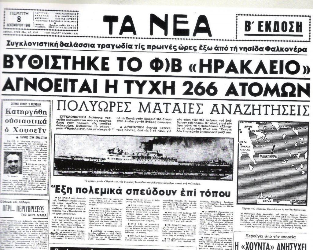 Είναι Τετάρτη 7 Δεκεμβρίου 1966, όταν οι κινηματογράφοι σε Αθήνα και Χανιά διαφημίζουν τις παροχές των πλοίων της εταιρίας Τυπάλδου ως τα «πολυτελέστερα, ανετότερα και, φυσικά, ασφαλέστερα». Λίγες ώρες μετά, στις 02.06 το πρωί της 8ης Δεκεμβρίου, το αγωνιώδες SOS του «Ηράκλειον» σηματοδοτεί τη σημαντικότερη ναυτική τραγωδία της τελευταίας πεντηκονταετίας στην Ελλάδα, γνωστή ως ναυάγιο […]