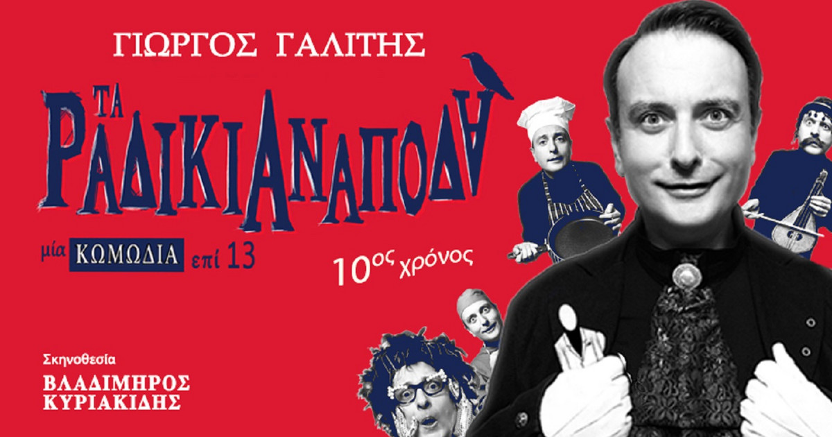 Ο ξεκαρδιστικός μονόλογος του Γιώργου Γαλίτη, δεν λέει να μας αφήσει χρόνους, να μείνει στον τόπο και να τινάξει τα πέταλα. Τώρα πια δεν τον πάνε τέσσερις αλλά δέκα! Δέκα χρόνια επικηδείας, δέκατη φορά θανατερά! Γι’ αυτό ήρθε η ώρα σας να δείτε «Τα Ραδίκια Ανάποδα», εν τόπω χλοερώ και αναψύξεως, μέχρι και τις 21 Ιανουαρίου, καθώς οι παραστάσεις πήραν παράταση λόγω επιτυχίας, σε νέο χώρο, στο Θέατρο «Altera Pars». Λίγα λόγια για το έργο: Πρόκειται για την πιο μαύρη, άραχλη, σπαραξικάρδια, ξεκαρδιστική και selfie παράσταση για τσέμπαλο, φαγκότο, φέρετρο και οστεοφυλάκιο. Ένα one dead man show, ένας black total κωμικός μονόλογος με δεκατρείς ρόλους. Δεκατρείς κωμικούς επικήδειους που και νεκ