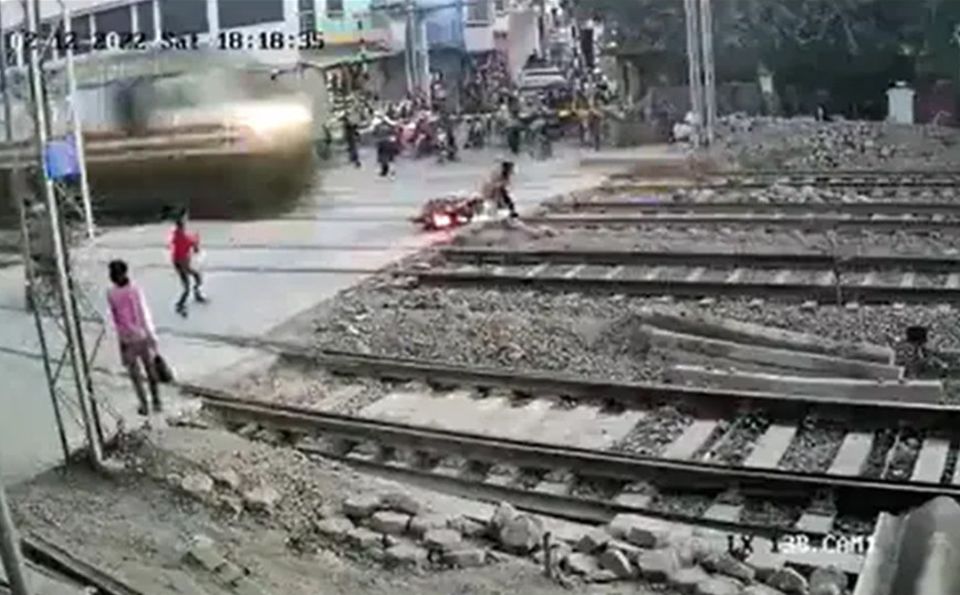 Στην Ινδία οι δρόμοι να είναι συνεχώς πηγμένοι από χιλιάδες αυτοκίνητα και μηχανάκια και οι κάτοικοι έχουν συνηθίσει σε μία συνύπαρξη τρόμου. Ωστόσο αυτό που έκανε ένας οδηγός μηχανής πιστεύοντας ότι προλάβαινε να περάσει από διάβαση τρένου, ενώ αυτό ήταν λίγα μέτρα μακριά, μπορεί να θεωρηθεί και ως αυτοκτονική κίνηση. Το απίθανο περιστατικό αφορά έναν, μάλλον απερίσκεπτο οδηγό μηχανής, ο οποίος -στην κυριολεξία-γλίτωσε από του χάρου τα δόντια. Συγκεκριμένα ο μοτοσικλετιστής προσπαθούσε να περάσει μια διάβαση σε γραμμές του τρένου στην Πραγιαγκράζ, ωστόσο εκείνη την στιγμή κατέφθανε ο συρμός. Όπως φαίνεται στο βίντεο που κάνει τον γύρο του διαδικτύου, ο άνδρας εντοπίζει τελευταία στιγμή τ