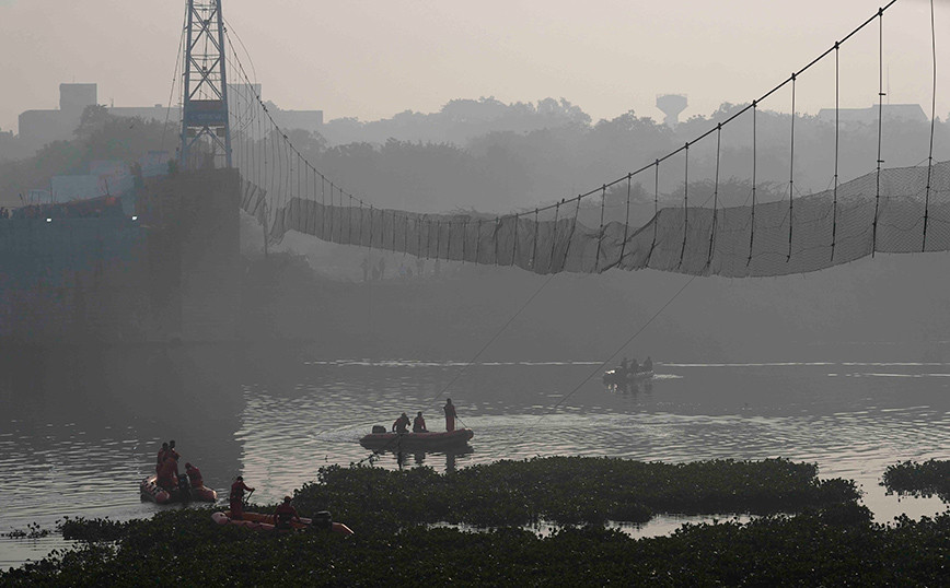 Σοκάρει η στιγμή που έπεσε η κρεμαστή πεζογέφυρα στην Ινδία, παρασύροντας στον θάνατο 134 άτομα, μεταξύ των οποίων πολλά παιδιά, σε ένα από τα χειρότερα δυστυχήματα στην ιστορία της χώρας τα τελευταία 10 χρόνια. Πλάνα λίγο πριν από την κατάρρευση δείχνουν μια ομάδα νεαρών ανδρών να βγάζουν φωτογραφίες και λίγα λεπτά μετά πέφτουν στο νερό, καθώς τα καλώδια που συγκρατούσαν την γέφυρα υποχώρησαν. Η πεζογέφυρα, πάνω από τον ποταμό Machchhu στο κέντρο της πόλης Morbi, ήταν γεμάτη με πιστούς που έπαιρναν μέρος στις εορταστικές εκδηλώσεις για το Ντιβάλι, όπως μεταδίδει το Reuters. Περίπου 35 θύματα ήταν μικρότερα των 14 ετών, σύμφωνα με κατάλογο των νεκρών που είδε το Reuters και 170 άνθρωποι ε
