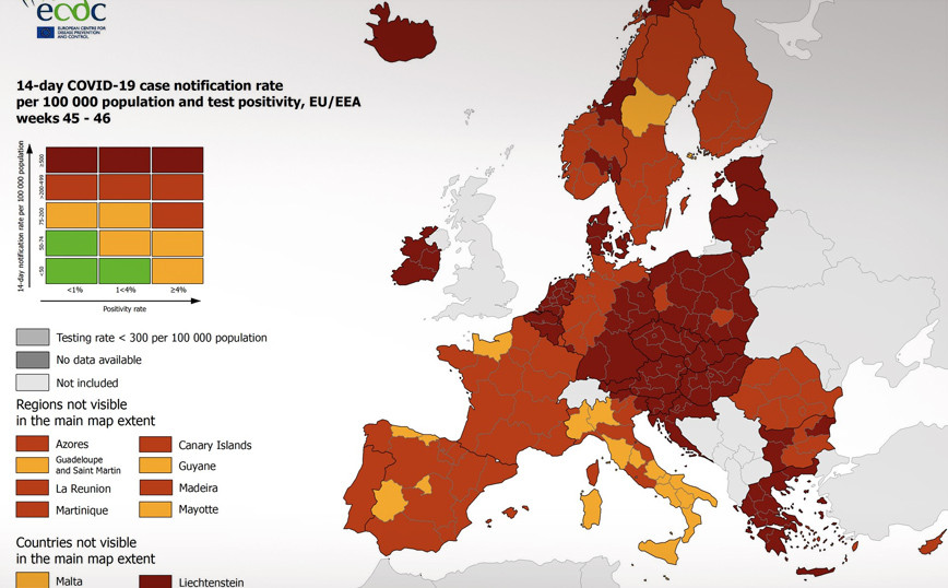 Κυβερνητικές «επιτυχίες» - Χάρτης ECDC: Στο «κόκκινο» όλη σχεδόν η Ευρώπη, στο… βαθύ «κόκκινο» η Ελλάδα