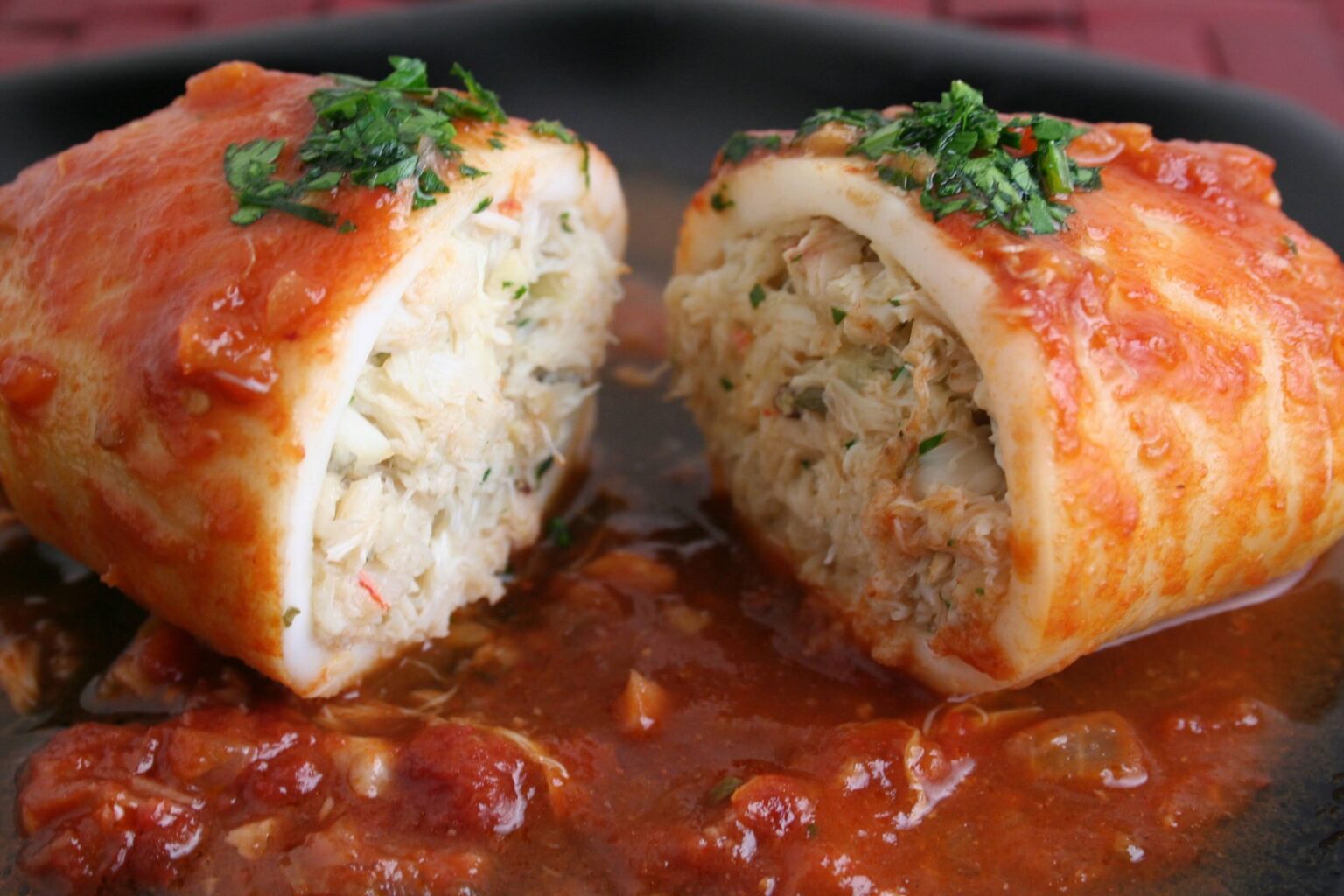 Καλαμάρια γεμιστά με πιπεριά και γραβιέρα
