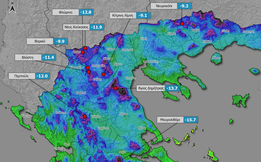 Πολύ ισχυρός παγετός εκδηλώθηκε κατά τόπους στα ηπειρωτικά της χώρας σήμερα το πρωί, σύμφωνα με το δίκτυο αυτόματων μετεωρολογικών σταθμών του Εθνικού Αστεροσκοπείου Αθηνών/meteo.gr. Σημαντικό ρόλο σε αυτό έπαιξαν ο ανέφελος ουρανός και η χιονοκάλυψη που υπάρχει σε αρκετές περιοχές μετά την κακοκαιρία Διομήδης. Οι ελάχιστες θερμοκρασίες έπεσαν κάτω και από τους -15 βαθμούς Κελσίου. Αναλυτικά: Μαυρολιθάρι Φωκίδας -15,7, Άγιος Δημήτριος Πιερίας -13,7, Φλώρινα -12,8, Περτούλι -12, Νέος Καύκασος Φλώρινας -11,9 και Βλάστη Κοζάνης -11,4 βαθμοί. Με πληροφορίες από meteo.gr ΔΙΑΒΑΣΤΕ ΕΠΙΣΗΣ: Λασίθι: Έξι άτομα έμειναν όλη τη νύχτα στα χιόνια Στον Δήμο Παύλου Μελά ο Στέλιος Πέτσας – Συνάντηση με Καλαφάτη