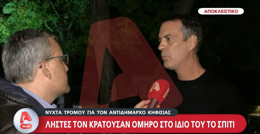 Στιγμές αγωνίας έζησε o αντιδήμαρχος Κηφισιάς, Γιάννης Παντελεάκης, ο οποίος έπεσε θύμα ληστείας μέσα στο σπίτι του και για περίπου μια ώρα ο ίδιος έγινε έρμαιο στα χέρια κουκουλοφόρων. Όπως περιέγραψε ο κ. Παντελεάκης στην κάμερα του Alpha, τέσσερις κουκουλοφόροι κλώτσησαν και έσπασαν την πόρτα του υπνοδωματίου του, όπου και εισέβαλαν, του επιτέθηκαν και τον ακινητοποίησαν. «Μου πετάνε από τα χέρια τον υπολογιστή, με ακινητοποιούν και μου ζητούν να κάνω ό,τι μου πουν, να συμμορφωθώ και πως δεν θα πάθω τίποτα. Μιλούσαν πολύ καλά ελληνικά, αλλά φαίνονταν ότι ήταν ξένης καταγωγής, γιατί ήταν λίγο σπαστή η ομιλία τους», περιέγραψε χαρακτηριστικά ο αντιδήμαρχος. Οι ληστές οδήγησαν τον ίδιο, τ