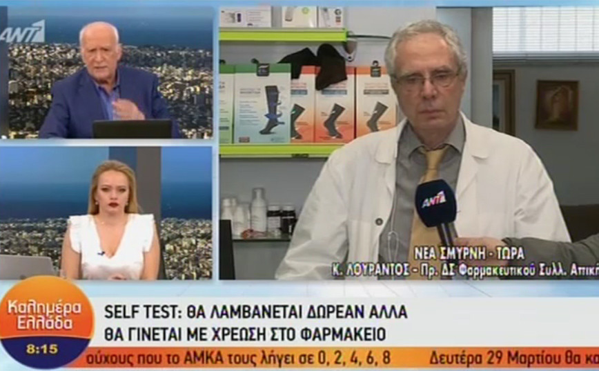 Τι λέει ο Πρόεδρος του Φαρμακευτικού Συλλόγου Αττικής για την αποζημίωση που θα ζητείται για τη διανομή των self test. Διευκρινήσεις για τα self test που θα διανέμονται από τα φαρμακεία έδωσε ο Κώστας Λουράντος, Πρόεδρος του Φαρμακευτικού Συλλόγου Αττικής, μιλώντας στον τηλεοπτικό σταθμό ΑΝΤ1 και την εκπομπή «Καλημέρα Ελλάδα».