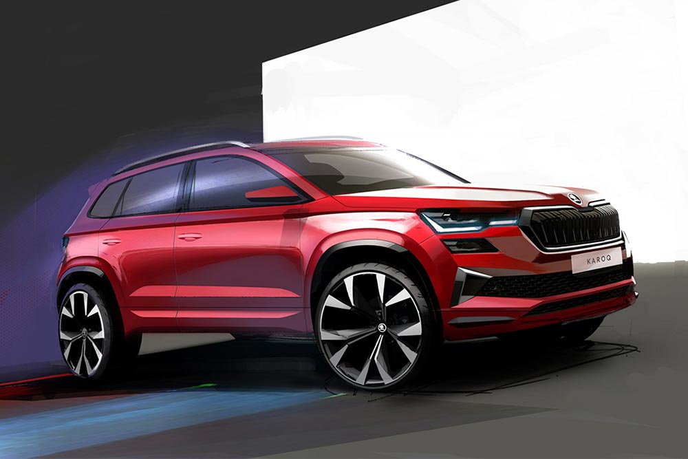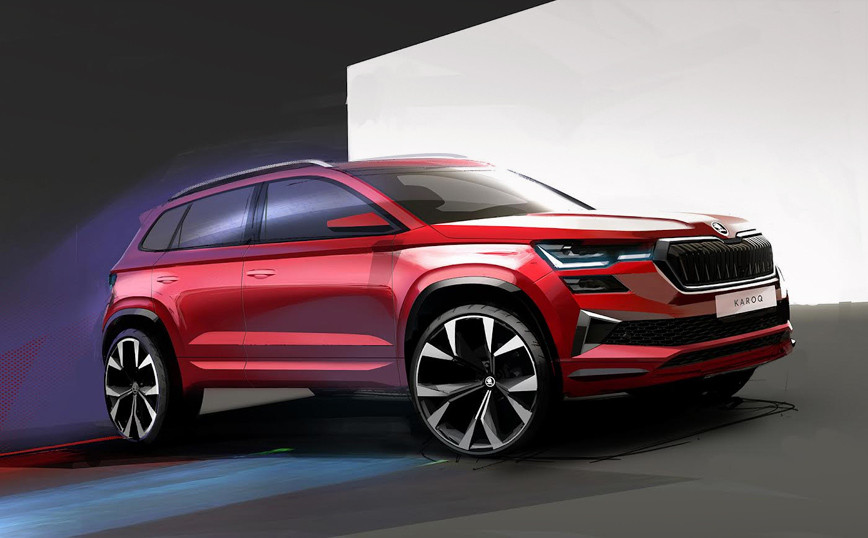 Η Skoda έδωσε στη δημοσιότητα δύο σκίτσα που δίνουν μία πρώτη γεύση του ανανεωμένου Karoq. Το επιτυχημένο compact SUV της μάρκας (παρουσιάστηκε πρώτη φορά το 2017) αναβαθμίζεται σε επίπεδο design αλλά και τεχνολογικά, με την πρεμιέρα να έχει προγραμματιστεί (ψηφιακά) για την Τρίτη, 30 Νοεμβρίου. Το ένα σκίτσο δίνει μία αίσθηση του νέου, εμπρός μέρους, με την μάσκα αυξημένη σε πλάτος και με διπλά κάθετα πηχάκια, αλλά και νέα εξαγωνική σχεδίαση, με φαρδιά εισαγωγή αέρα στο κάτω μέρος. Οι προβολείς έχουν πιο λεπτό design σε σχέση με την προηγούμενη έκδοση και εκτείνονται μέχρι τη μάσκα. Η δυναμική εμφάνισή τους υπογραμμίζεται από τα επανασχεδιασμένα φώτα ημέρας που πλέον αποτελούνται από δύο