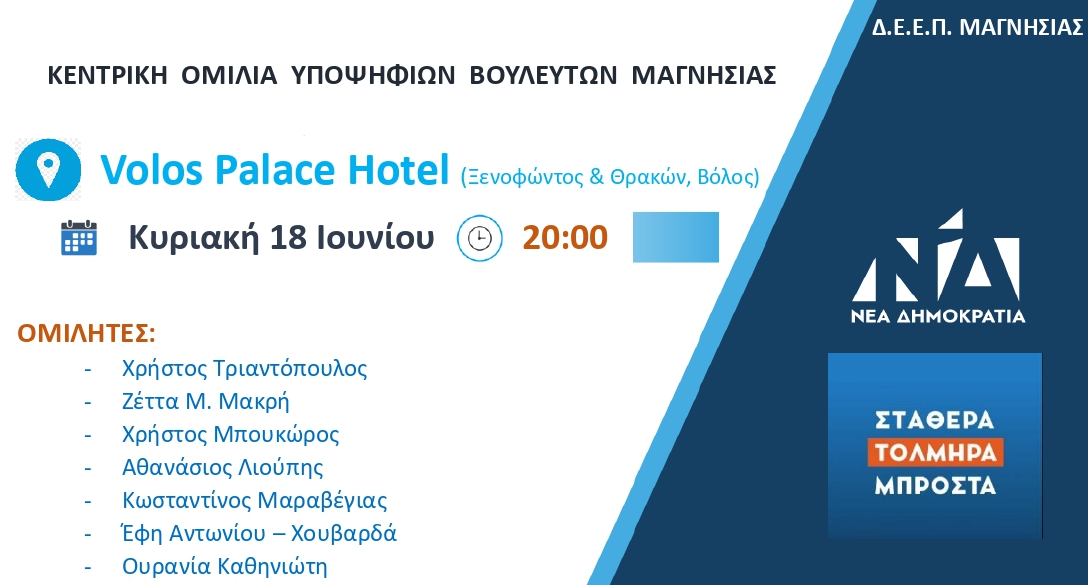 Την περίοδο 19-23 Ιουνίου, ο κ. Χρήστος Τριαντόπουλος, υποψήφιος Βουλευτής Μαγνησίας και Υφυπουργός στον Πρωθυπουργό την περίοδο 2021- 2023, θα πραγματοποιήσει επισκέψεις στην Κρήτη, στην Εύβοια και στη Σάμο, στο πλαίσιο των επισκέψεων των κλιμακίων της Νέας Δημοκρατίας σε όλη την επικράτεια.Συγκεκριμένα, μαζί και με άλλα στελέχη της Νέας Δημοκρατίας σήμερα, Δευτέρα, 19 Ιουνίου, θα […]