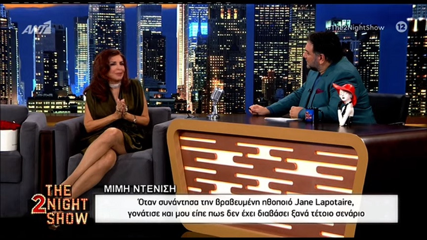 Το κατώφλι του «The 2Night Show» πέρασε η Μιμή Ντενίση, η οποία μίλησε για την καριέρα της στο χώρο της υποκριτικής, που μετρά πάνω από 30 χρόνια. Σ’ αυτήν καταπιάστηκε με πολλά πόστα, της ηθοποιού, της θεατρικής συγγραφέως, της σκηνοθέτιδας και της παραγωγού. Και όλα αυτά για να είναι σε θέση να στήνει τις δουλειές της όπως ακριβώς της οραματίστηκε. Αυτό που απέφυγε στο επάγγελμα ήταν οι κακίες και οι ίντριγκες. Παρ’ όλα ταύτα έχει δεχθεί κατά καιρούς επιθέσεις. «Υπήρξαν στιγμές που πικράθηκα και που είπα γιατί τόση αδικία σε εμένα. Ο χώρος έχει πάρα πολλούς ανθρώπους αμόρφωτους, ακαλλιέργητους, ατάλαντους και κακούς. Είπα, γιατί τα βάζουν με μια γυναίκα, που έχει τις γνώσεις