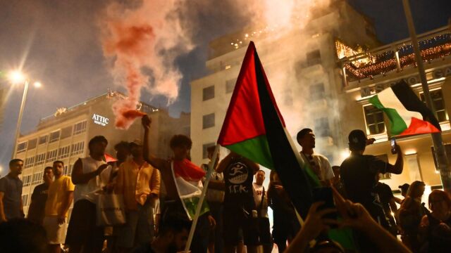 Διαδηλωτές έχουν στήσει πανό, φωνάζουν συνθήματα και έχουν ανάψει καπνογόνα, στη κινητοποίηση για την Παλαιστίνη στο Μοναστηράκι