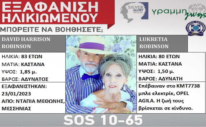 Συναγερμός έχει σημάνει στη Μεσσηνία από την εξαφάνιση ηλικιωμένου ζευγαριού, που δεν έχει δώσει σημεία ζωής από τις 23 Ιανουαρίου. Ο 83χρονος David Harrison Robinson και η 80χρονη σύζυγός του, Lukretia Robinson έφυγαν από το σπίτι τους, στην περιοχή Ντάπια Μεθώνης του δήμου Πύλου Νέστορος στην Μεσσηνία, με το αυτοκίνητό τους μάρκας OPEL AGILA DIESEL 1300, μοντέλο 2009, χρώματος μπλε ελεκτρίκ, με αριθμό κυκλοφορίας ΚΜΤ7738. Πιθανός προορισμός τους ήταν η Μονεμβασιά. Ο David έχει λευκά μαλλιά, καστανά μάτια, ύψος 1,85μ και είναι αδύνατος. Φοράει καπέλο με μεγάλο γείσο. Η Lukretia έχει γκρίζα μαλλιά (φοράει περούκα), καστανά μάτια, ύψος 1,50μ και είναι αδύνατη. Η ΓΡΑΜΜΗ ΖΩΗΣ ειδοποιήθηκε απ