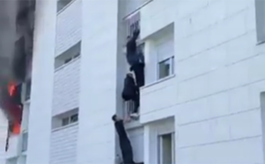 Σκαρφαλώνουν στα πρεβάζια, φτιάχνουν μιαν ανθρώπινη σκάλα και κατεβάζουν από το φλεγόμενο διαμέρισμα την οικογένεια και το μω