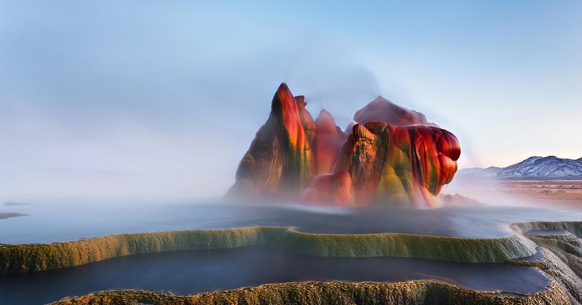 Πρόκειται για ένα μέρος που είναι τόσο συγκλονιστικά εντυπωσιακά, που δύσκολα φαντάζεσαι πως είναι αληθινό. Ο λόγος για το Fly Geyser στη Νεβάδα που δημιουργήθηκε το 1916, όταν ο ιδιοκτήτης της έκτασης στην οποία βρίσκεται, έκανε μια γεώτρηση για νερό έτσι ώστε να δημιουργήσει καλλιεργήσιμες εκτάσεις. Η γεώτρηση έφτασε πολύ κοντά σε μια κοιλότητα γεωθερμικής ενέργειας, όπου διαπιστώθηκε πως το νερό είναι απίστευτα ζεστό, γεγονός που καθιστούσε απαγορευτική τη χρήση του για το πότισμα των καλλιεργειών, αφού η θερμοκρασία του άγγιζε τους 93 βαθμούς Κελσίου. Τα χρόνια πέρασαν και το 1964, μια εταιρεία γεωθερμικής ενέργειας έκανε μια δεύτερη γεώτρηση. Το νερό όμως, τότε διαπιστώθηκε πως δεν ή