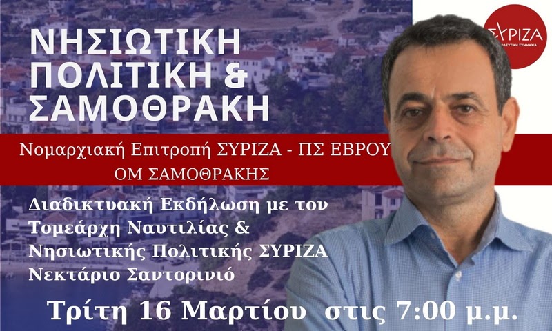 Διαδικτυακή εκδήλωση της Ν.Ε. ΣΥΡΙΖΑ-ΠΣ Έβρου με θέμα: «Νησιωτική Πολιτική και Σαμοθράκη»