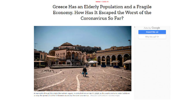 «Το κλειδί για την επιτυχία της Ελλάδας, λένε οι αναλυτές, ήταν τα πρώτα βήματα της κυβέρνησης για τον περιορισμό του ιού πιο πριν από το μεγαλύτερο μέρος της Ευρώπης. Στα τέλη Φεβρουαρίου, πριν καταγραφεί θάνατος από την ασθένεια, τα καρναβάλια ακυρώθηκαν. Τα σχολεία, οι καφετέριες,