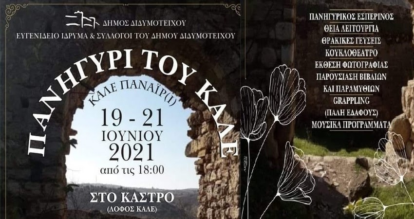 Ο Δήμος Διδυμοτείχου, το «Ευγενίδειο» Κέντρο Πολιτισμού και Σύλλογοι του Δήμου Διδυμοτείχου συνδιοργανώνουν το Πανηγύρι του Καλέ (Καλέ Παναΐρ) από 19 έως 21 Ιουνίου 2021. ΠΡΟΓΡΑΜΜΑ ΕΚΔΗΛΩΣΕΩΝ 19 - 21 Ιουνίου 2021Σάββατο 19 Ιουνίου18:00 - 20:30 Στους χώρους του Λαογραφικού Μουσείου Διδυμοτείχου θα δίδονται πληροφορίες στους επισκέπτες.Η είσοδος ελεύθερη.18:30 Παράσταση κουκλοθεάτρου με τίτλο «Ιστορικά δρώμενα μέσα από τα μάτια ενός παιδιού» από την εκπαιδευτικό κα Πασχαλίδου Χρυσοβαλάντου. Τα κείμενα της παραστάσεως του κουκλοθεάτρου έχουν γραφτεί από το Κ.Δ.Α Π. Carousel.Χώρος διεξαγωγής: Στον αύλειο χώρο του Καστρινού.19:00 Μέγας Πανηγυρικός Εσπερινός και αρτοκλασία στον Ιερό Ναό Σωτήρος Χριστο