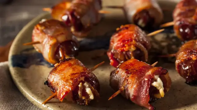 Χουρμάδες γεμιστοί με μπλε τυρί καρύδια, τυλιγμένοι με μπέικον